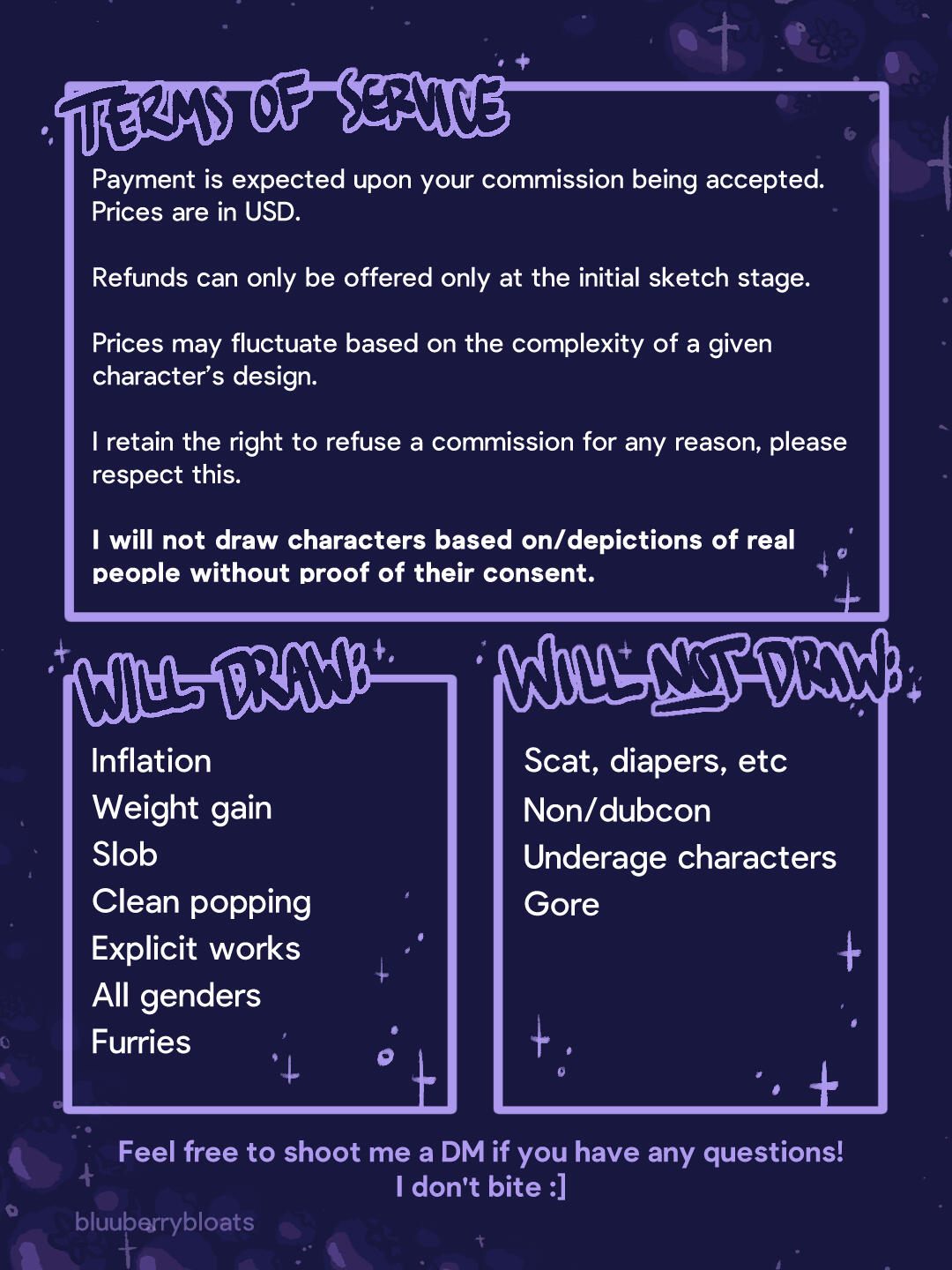 my commissions are closed at the moment, but feel free to look over my current pricing and terms of service!